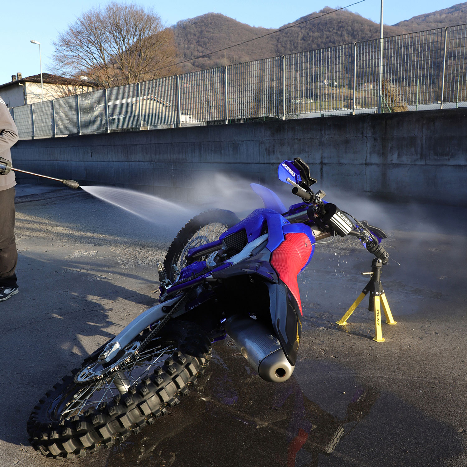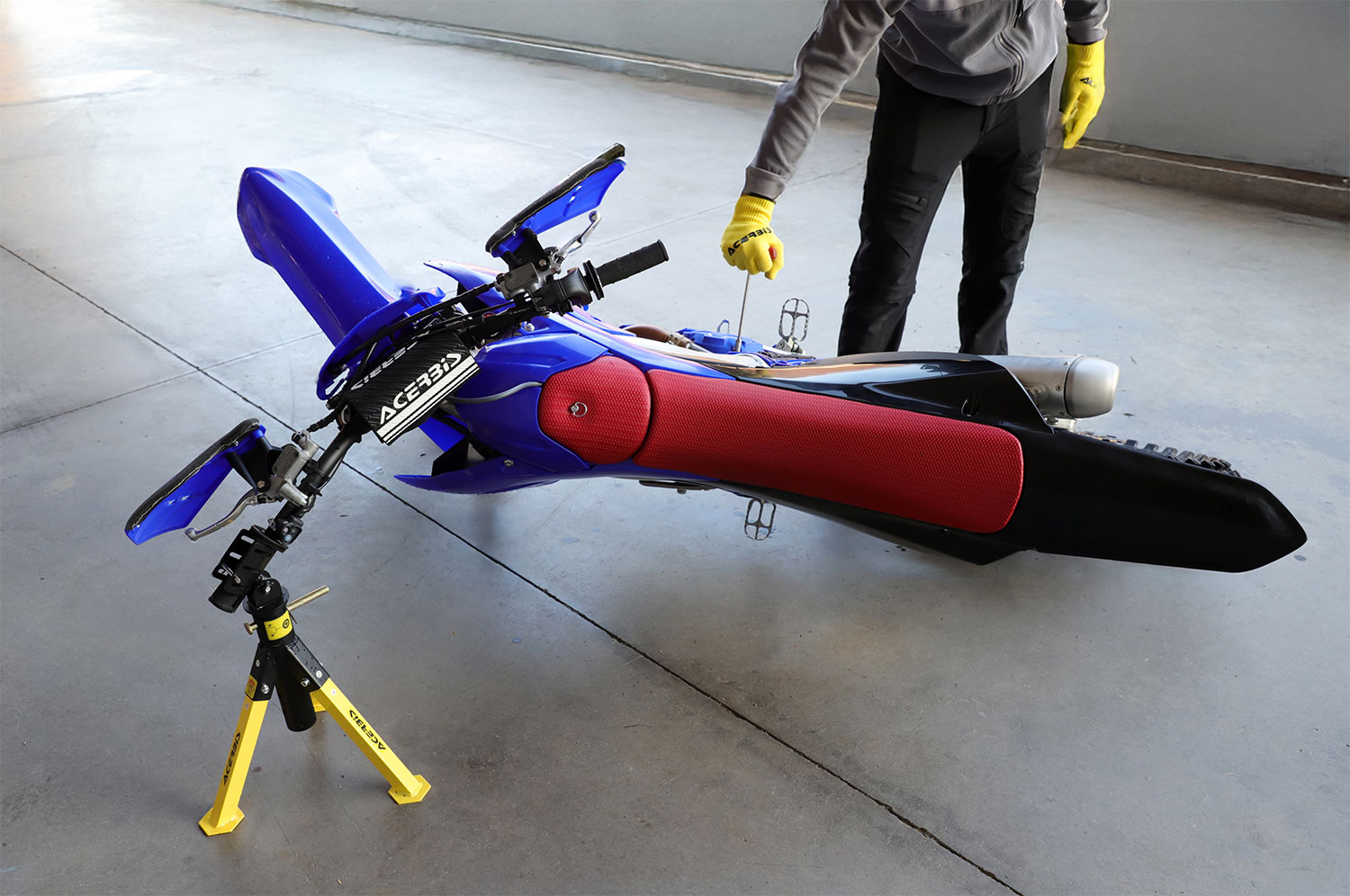 В наклонена позиция мотоциклетът се опира на кормилото, което улеснява измиването и достъпа до труднодостъпните зони под двигателя и в долната част на рамата. Тази конфигурация е удобна и за по-леки механични дейности, като например обслужване на съединителя, без да се налага източване на маслото.
