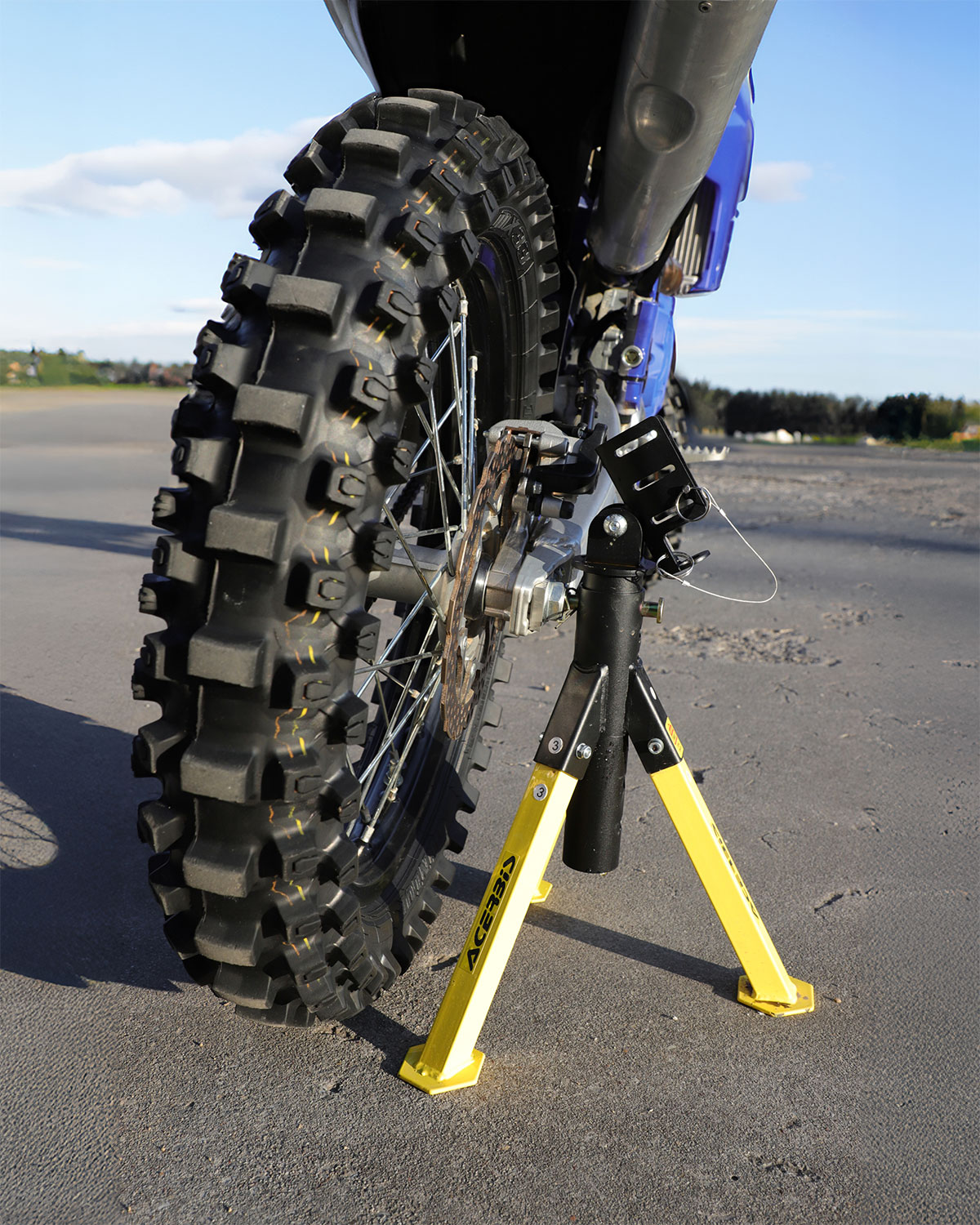 В изправена позиция стойката използва щифт, който влиза в главината на задната джанта и осигурява стабилно паркиране. Това я прави подходящ избор за гараж, сервиз, падок и ежедневна поддръжка.